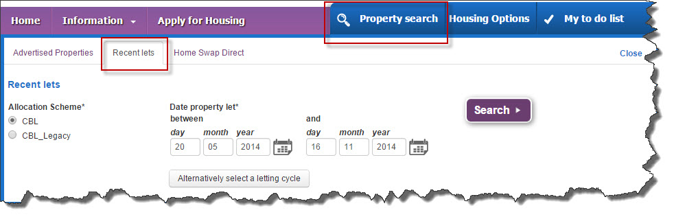 We publish information about homes that have been successfully let. We tell you the number of applicants that bid for the property, the band and priority date of the successful applicants. You can see these results by using the Recent Lets tab from the PropertySearch panel from the main navigation.